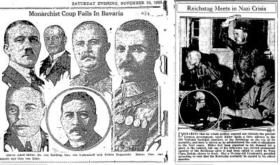 The Nazi's Beer Hall Putsch in Munich was two months later. This failed coup d'état resulted in a conviction of treason and a 5-year prison sentence for Hitler. The putsch and its "Hitlerites" were covered extensively in American papers, including in Erie, where it was referred to as a "tragic comedy" with Hitler mocked as a Don Quixote. Despite its failure though, it provided the Nazis something else of value: visibility. After nine months, Hitler was released.