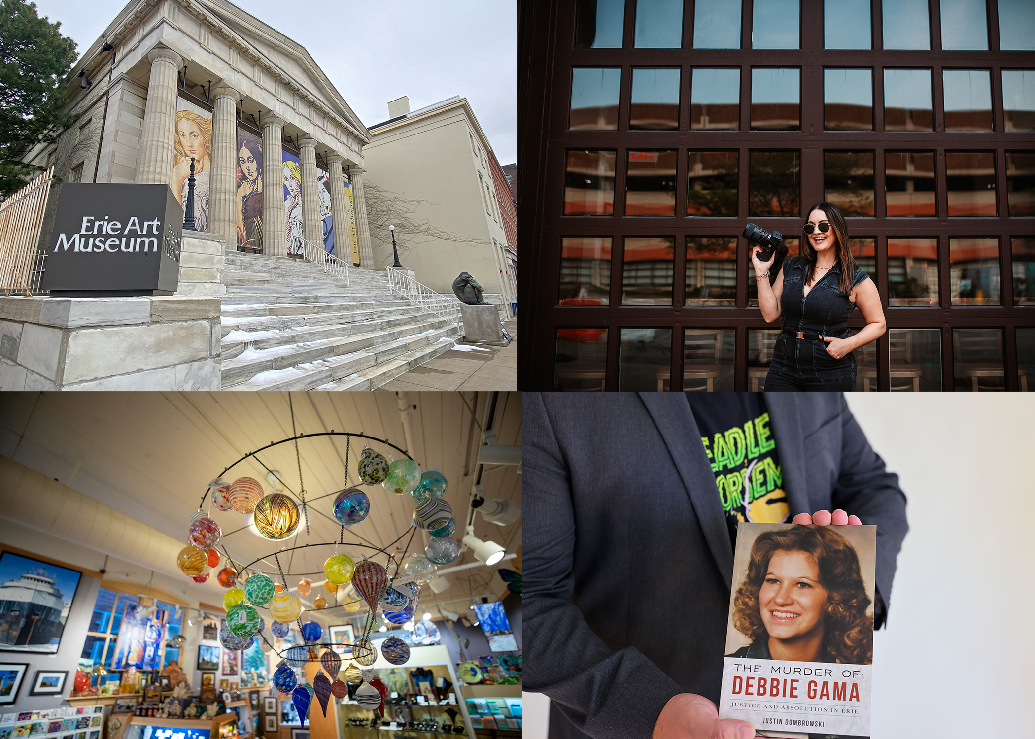 (Clockwise from top left) Winner of Best Museum is the Erie Art Museum, winner of Best Photographer is the Erie Reader's own Jessica Hunter Photography, winner of Best Local Author is Justin Dombrowski, and winner of Best Art Gallery (along with Best Boutique and Best Gift Shop) is Glass Growers Gallery. (Photos: Jessica Hunter)
