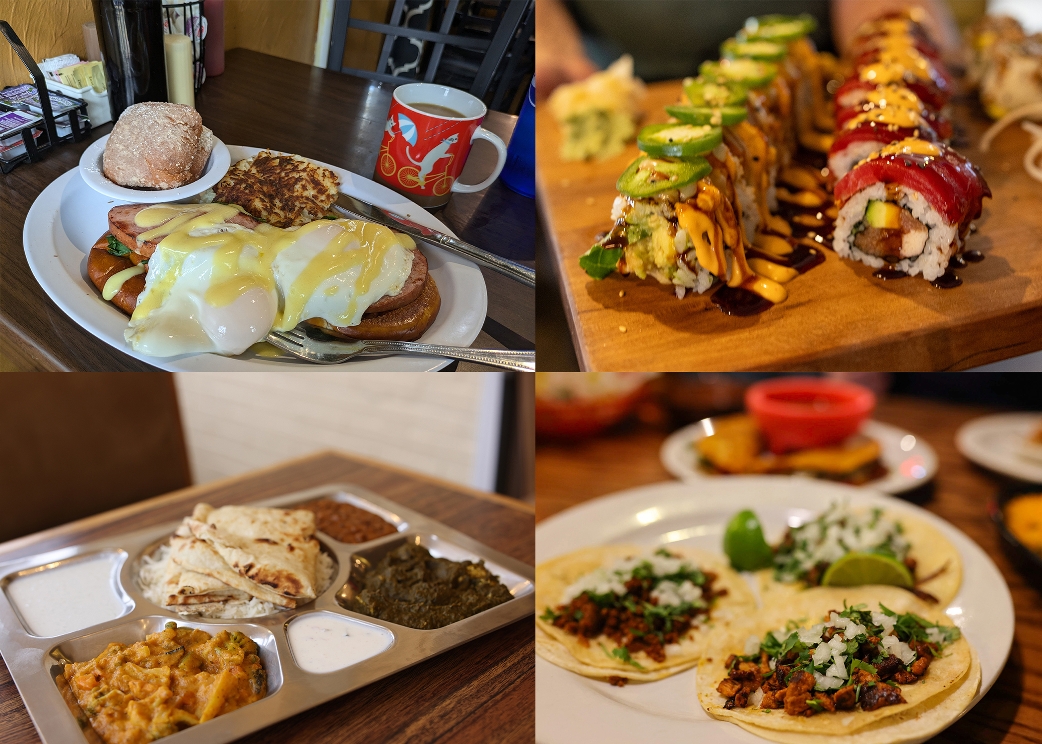 (Clockwise from top left) Winner of Best Brunch is Flip Cafe in Edinboro, winner of Best Sushi is Samurai Kitchen, winner of Best Mexican Food and Best Taco is El Amigo, and winner of Best Indian/Nepali Food is Tandoori Hut. (Photos: Erin Phillips / Jessica Hunter)