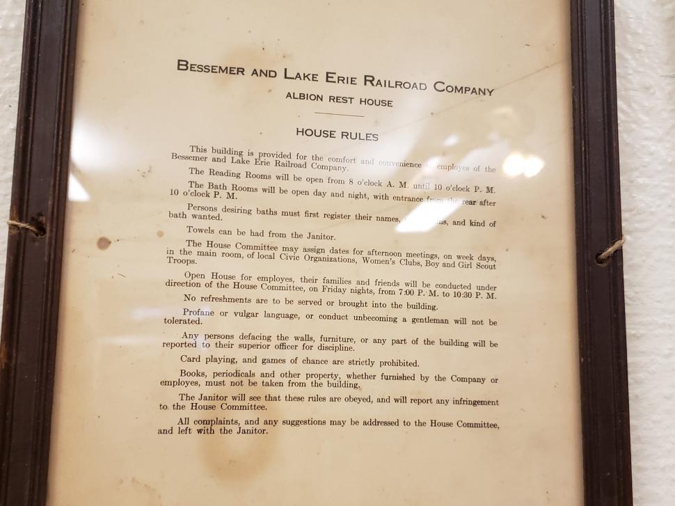 The Albion library is in the former rest quarters for the Bessemer and Lake Erie Railroad Company, whose house rules — still posted — prohibit vulgar language, playing cards, and games of chance.