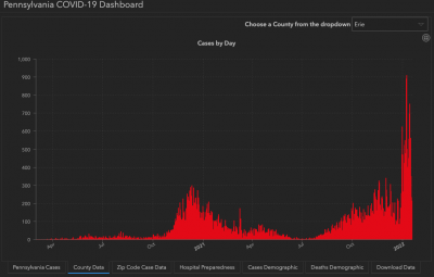 In the last week, there have been 3,363 new cases of COVID-19 reported in Erie County According to the PA Department of Health, down from last week's all-time high of 4,162 new cases reported the previous week, compared to 2,970 the week prior, and 1,080 the week before that. This is the second-highest weekly total (Wednesday to Wednesday) of new cases since the pandemic began.
