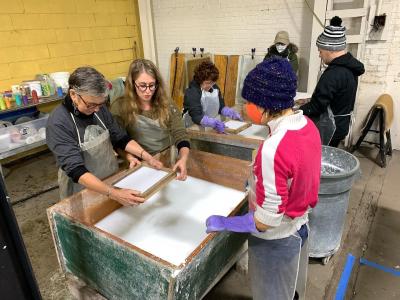 The first time I met Ashley Pastore, creator and owner of Grounded Print Shop — a printmaking, papermaking, and artist residency space — was in March of 2020. Yes, that March of 2020. My daughter had taken it upon herself to spearhead a paper recycling program in her 2nd grade classroom. She brought in her own recycling bin, and for a while we were just putting the classes' paper in with our own weekly recycling. But then I learned about Grounded Print Shop, and Ashley Pastore, and how she turns discarded paper products into recycled, handmade art and paper in her shop. I thought about how beneficial it would be for my daughter to actually see recycling in action. It so happens that the day we delivered that first load of paper for recycling was my daughter's last day of normal school for a long time. There was an incredible, theatrically strong wind blowing in swirls and gusts as we met Pastore outside of her original shop to pass off that bag of paper. The wind amplified the shared surreal, apocalyptic feeling of anxiety and disbelief and confusion that everyone was feeling at that time.