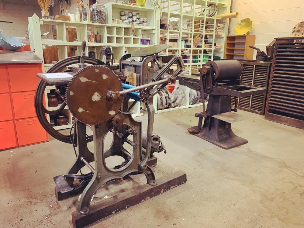 So what does the present and future hold for the new Grounded Print Shop? Not only is major work ongoing to make some primitive areas of the shop more usable, but a lot of work has already been completed in the main studio area of the building. Pastore has equipment available for artists to use in the studio space including everything necessary for paper-making, including a five pound Hollander Beater (a machine used to produce paper pulp), three different letterpress machines, two etching machines that can accomplish etching, monoprint, woodblock, and linoleum block printing as well as a Risograph machine. She is also using the building as a music venue. She has installed 26 raised garden beds on the grounds for a community garden. She has hosted open houses to provide demonstrations of the equipment, and will soon be resuming classes for children and adults alike, to teach the basics of papermaking, bookbinding, and printmaking.