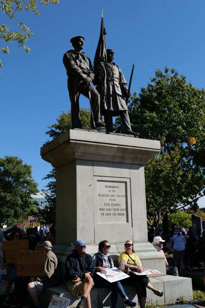 Perry Square was filled with protesters young and old, with tents along the margins of the park to provide community members with resources such as voter registration and information on activist organizations like 50501 Erie, French Creek Indivisible, and Fair Districts PA.