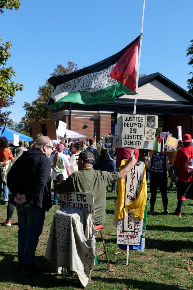 An attendee of the protest named Rachel, who requested her last name to be omitted, explained that she worries for the future of her children, including her son who requires regular medical care. At the same time, activist Carlos Mora approached the stage to speak. Originally from Colombia, he explained how he witnessed the violence that breeds under a corrupt government and does not want the same for the United States. "I simply don't want to live again in a place where violence, corruption, and the lack of rule of law has become the norm," Mora said. He encouraged the crowd to continue fighting for their rights and the rights of others, to get involved with mutual aid organizations, or simply register to vote. "It's time to take control back. It's time to organize and put ourselves in an uncomfortable situation. It's time to have uncomfortable conversations, to talk to one another, right now," he said.