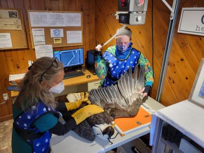 For a red-tailed hawk with a wing fracture, follow-up x-rays taken mid-treatment showed that bone healing was proceeding more slowly than was typical, so his time in a splint was extended. For an eagle with a swollen foot and wound, the diagnostic x-ray confirmed there was no bone infection involved with the injury, so the patient had a promising prognosis and was able to receive less aggressive treatment, and no oral antibiotics or surgery were needed.