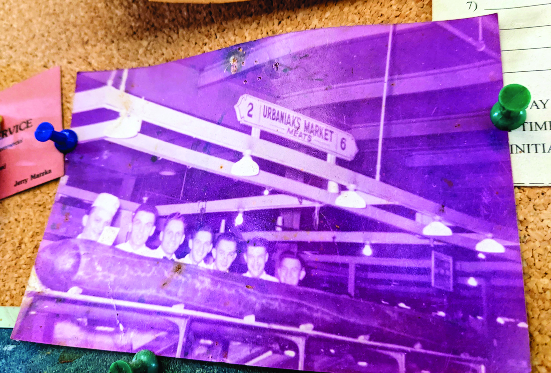 This faded, vintage photo shows the very early days of Urbaniak Brothers Meats, when they ran their operation out of Erie's Central Market House. From left: Ben Urbaniak, Chet Urbaniak, Eddie Urbaniak, Ted Urbaniak, Richie Izbicki, Joe Wasielewski, and Danny Ropelewski.