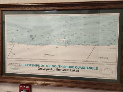 When I arrived at the office of James Hall, site administrator for the Erie Maritime Museum, on a cold January morning, he was excited to show me a map in his hallway. At its bottom, in blue capital letters, it read: GHOSTSHIPS OF THE SOUTH SHORE QUADRANGLE. Above the text, I saw our portion of Lake Erie, with Ohio on the left, New York on the right, and Presque Isle's hook, dead center. Along the lake were dozens of little ship icons indicating sunken vessels – schooners, ferries, brigs, barges, steamboats, and more – peppered across the water with surprising regularity.